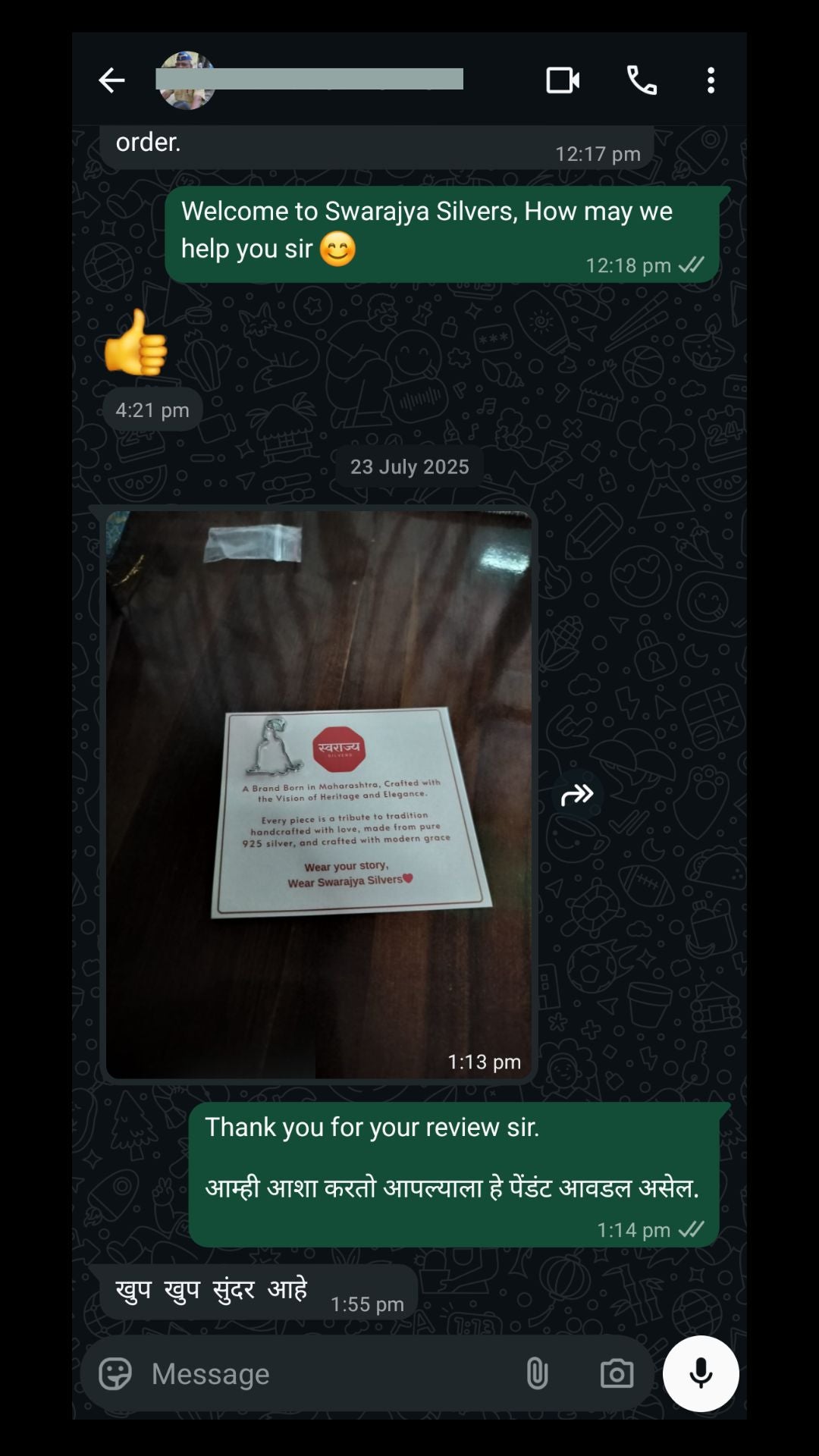 For any queries or support related to your order, our Customer Assistance Team is here to help. Whether you need help with product details, delivery updates, or post-purchase support, feel free to reach out. You can contact us via WhatsApp at +91 91672 52916 or email us at support@swarajyasilvers.com